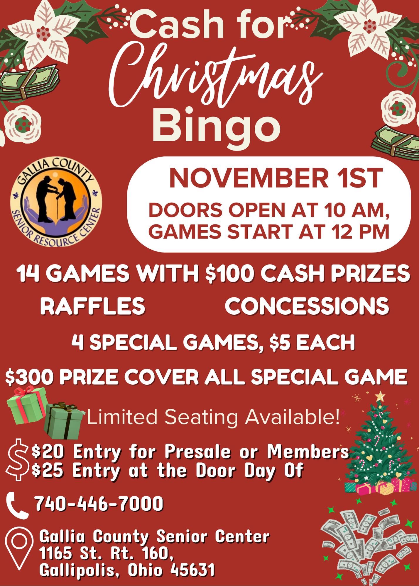 BINGO will be 14 Games ALL at $100 cash prizes each. 4 Special Games that are $5.00 each. $300 Coverall Special Game. Concessions available. Raffles. $20 for Members/Presale Tickets & $25 At the door for day of BINGO. Please stop in at 1165 St. Rt. 160 Gallipolis, OH 45631 to purchase tickets. For Questions call 1-740-446-7000. Limited Seating Available. Doors Open at 10AM & BINGO starts at NOON.