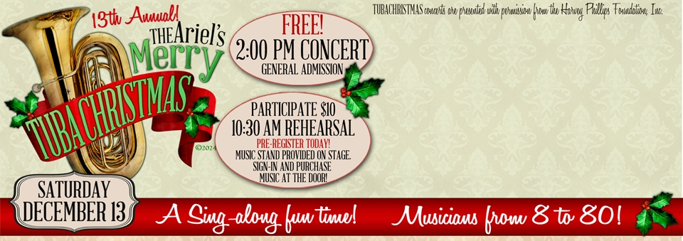 Bring your Tuba, Baritone, Euphonium, or other big brass buddy and join in the fun at the Ariel Theatre! Participants payย $10 to participate and will receive a 2024 commemorative button! Plus there are lots of souvenirs and music books available for purchase! Register at the door, or save time andย Pre-Register hereย and weโll have everything ready for you when you arrive!