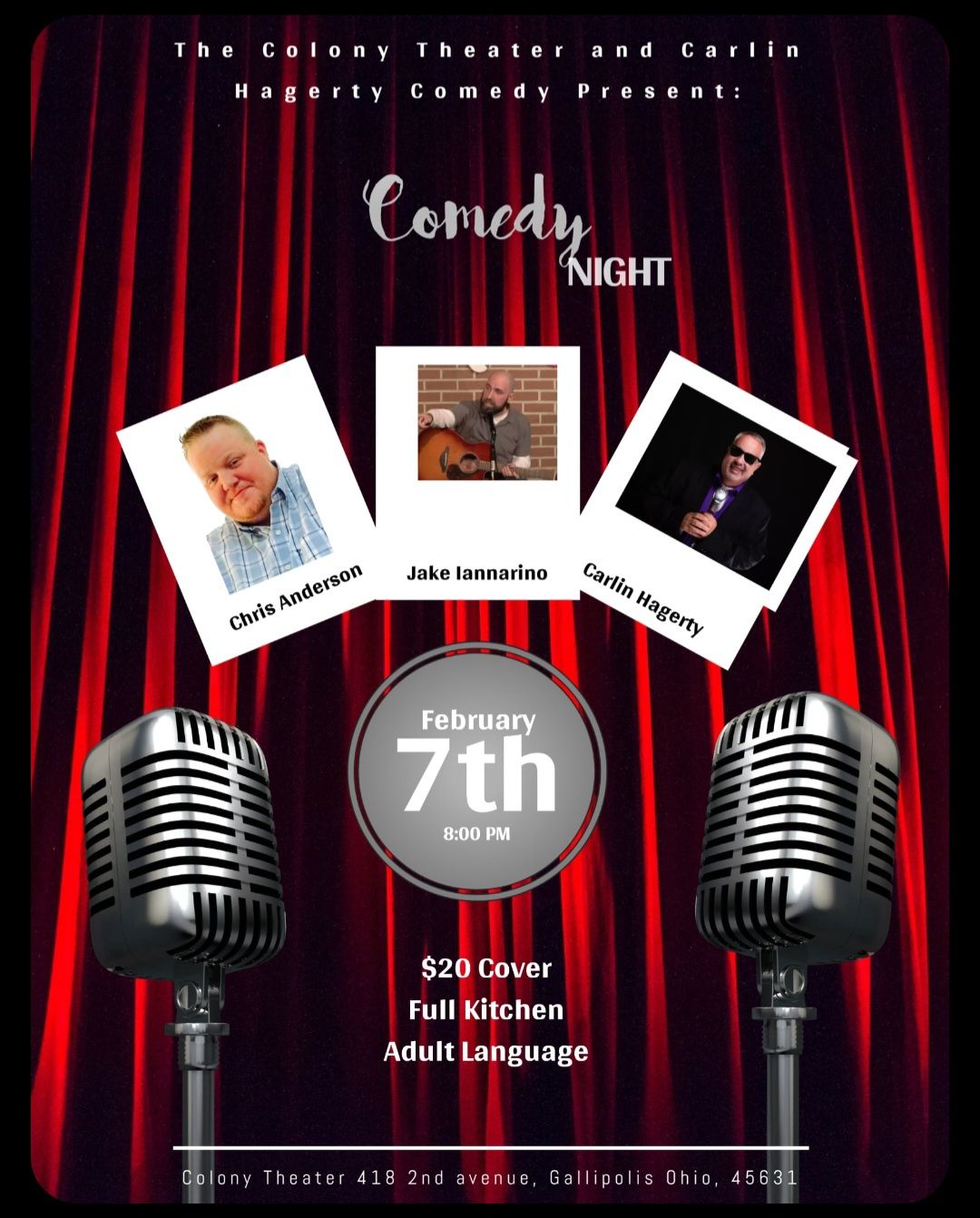 The Colony Theater and Carlin Hagerty Comedy Present: Comedy Night!! Christ Anderson – Jake Iannarino – Carlin Hagerty $20 Cover – Full Kitchen *Warning: Adult Language https://www.facebook.com/events/1398070338647388 , ...