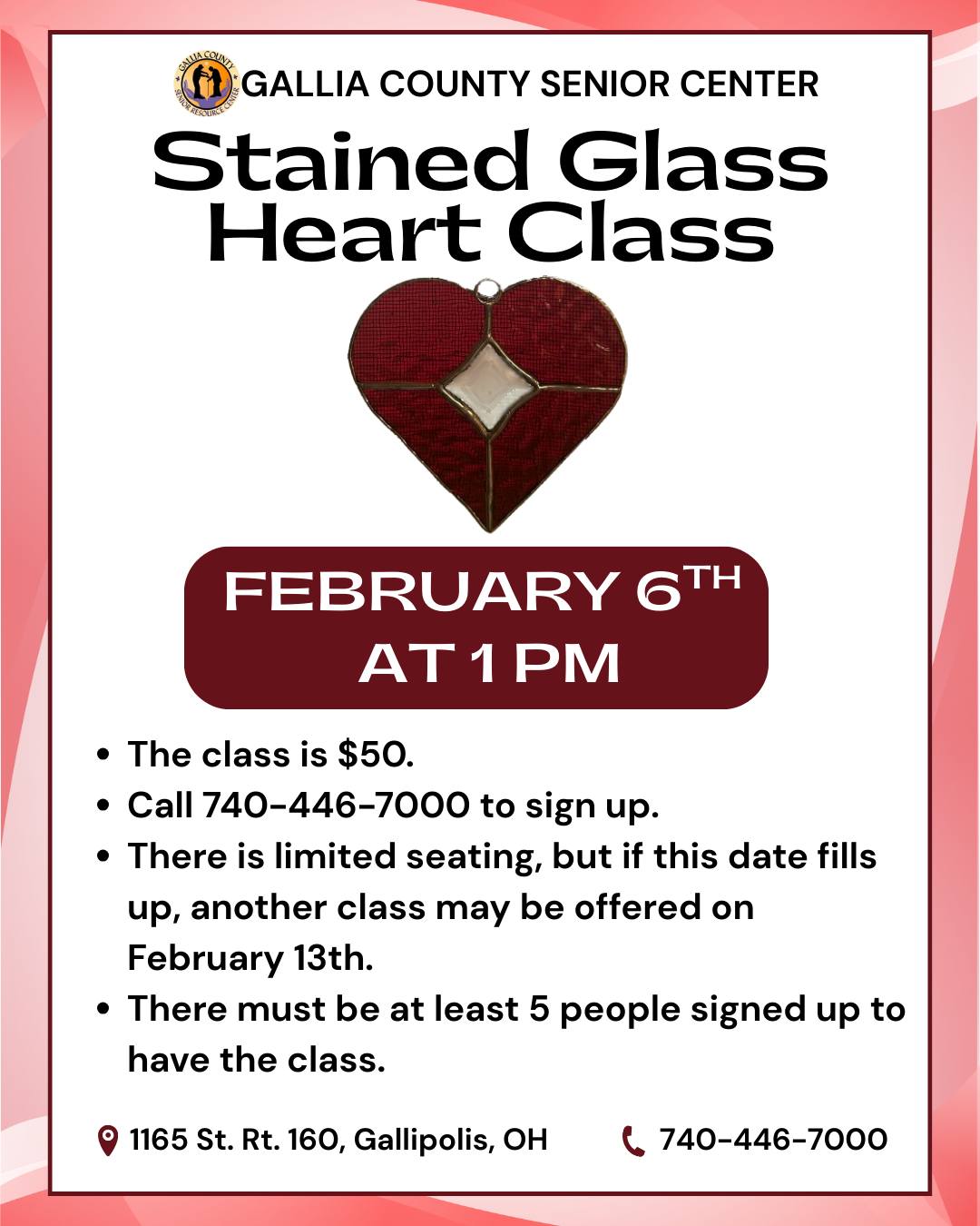 The class is $50 Call 740-446-7000 to sign up There is limited seating, but if this date fills up, another class may be offered on February 13 There must be at least 5 people signed up to have the class https://www.facebook.com/events/1209028054067941 , ... - 7Valentine Macrame Class2:00 am - 4:30 pm