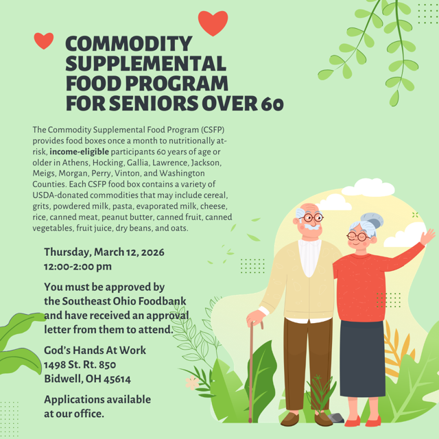 The Commodity Supplemental Food Program (CSFP) provides food boxes once a month to nutritionally at-risk, income-eligible participants 60 years or older in Athens, Hocking, Gallia, Lawrence, Jackson, Meigs, organ, Perry, Vinton and Washington Counties. Each CSFP food box contains a variety of USDA donated commodities that may include cereal, grits, powdered milk, pasta, evaporated milk, cheese, rice, canned meat, peanut butter, canned fruit, canned vegetables, fruit juices, dry beans and oats.