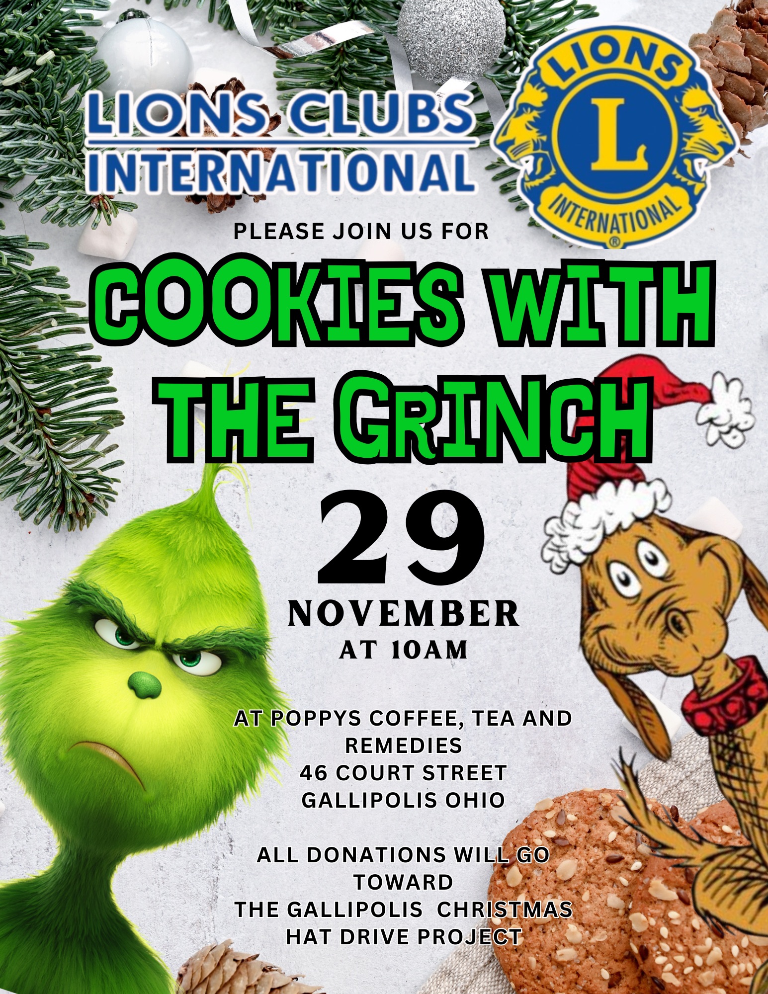 Cookies with the Grinch Please come have cookies and donate to the hat drive project https://www.facebook.com/events/1569883924343106 + Add to Google Calendar + iCal / Outlook export 00 days 00 hours 00 minutes 00 seconds Date Nov 29 2025 Time 10:00 am - 12:00 pm Location Poppy's Coffee, Tea & Remedies 46 Court Street, Gallipolis, OH 45631 Category Family Fun Holiday Attraction Organizer Gallipolis Lions Club Share this event