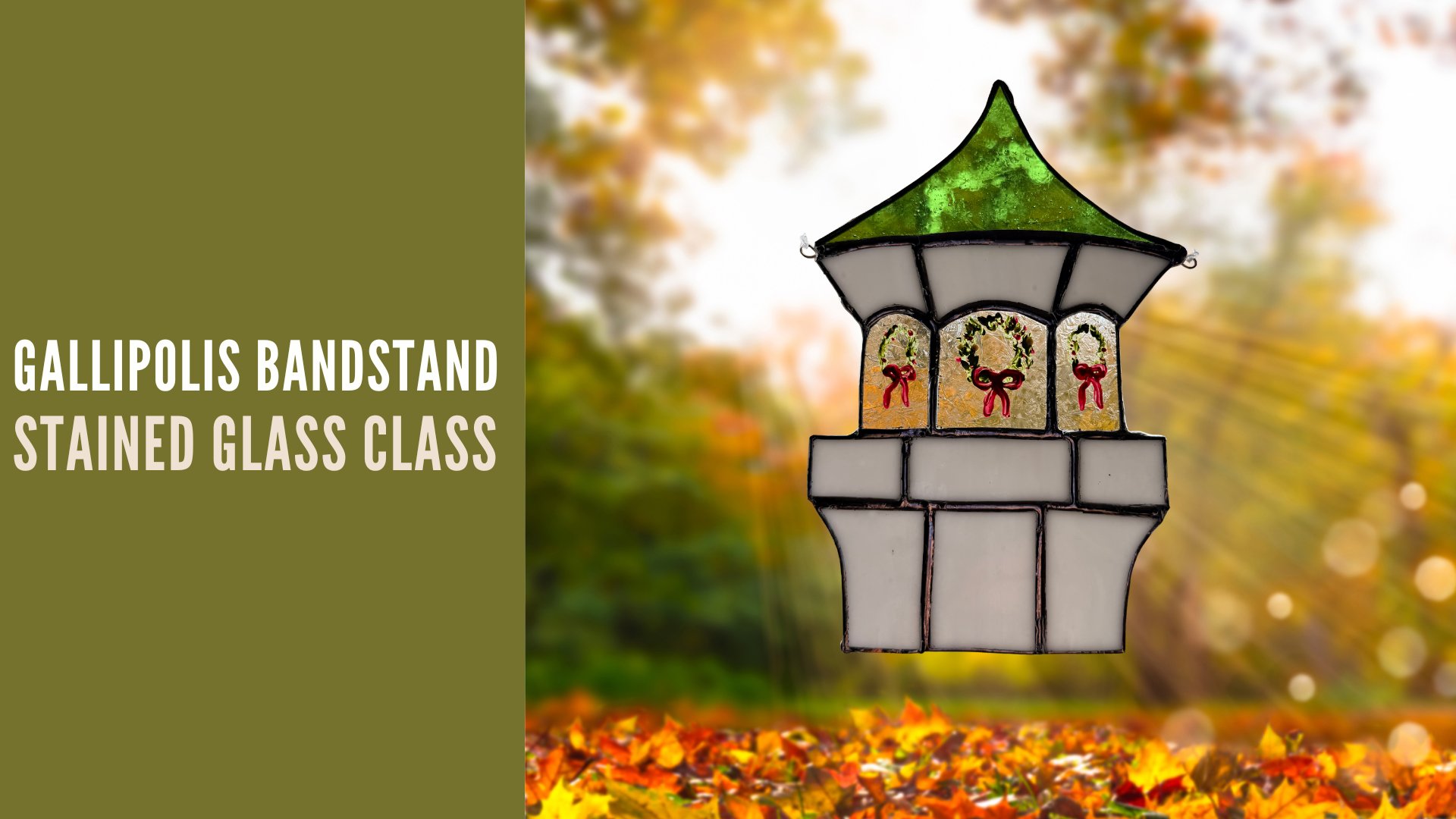 Join this class to create your own iconic Gallipolis Bandstand using the Tiffany method of stained glass! All tools and materials are provided. Glass wreaths are painted and cured, ready when you arrive, so that you can make and take this historic landmark and share your holiday cheer right from your favorite window!