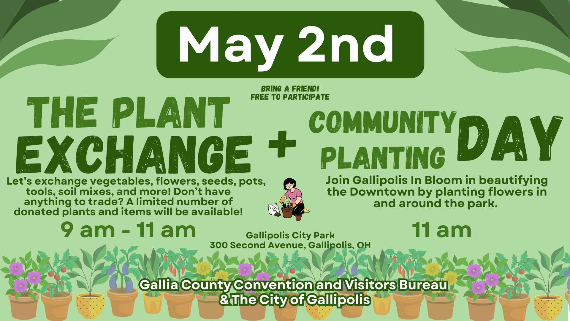 Do you love gardening or want to try it out? Then don’t miss The Plant Exchange! On May 2nd from 9 AM to 11 AM, the Gallia County Convention and Visitors Bureau invites you to the Gallipolis City Park. We welcome anything garden-related, including flowers, vegetables, greenery, succulents, seeds, bulbs, soil mixtures, empty flats, pots, cuttings, herbs, tools, and more! Organized tables will be available for you to drop off your items and pick up new ones.
